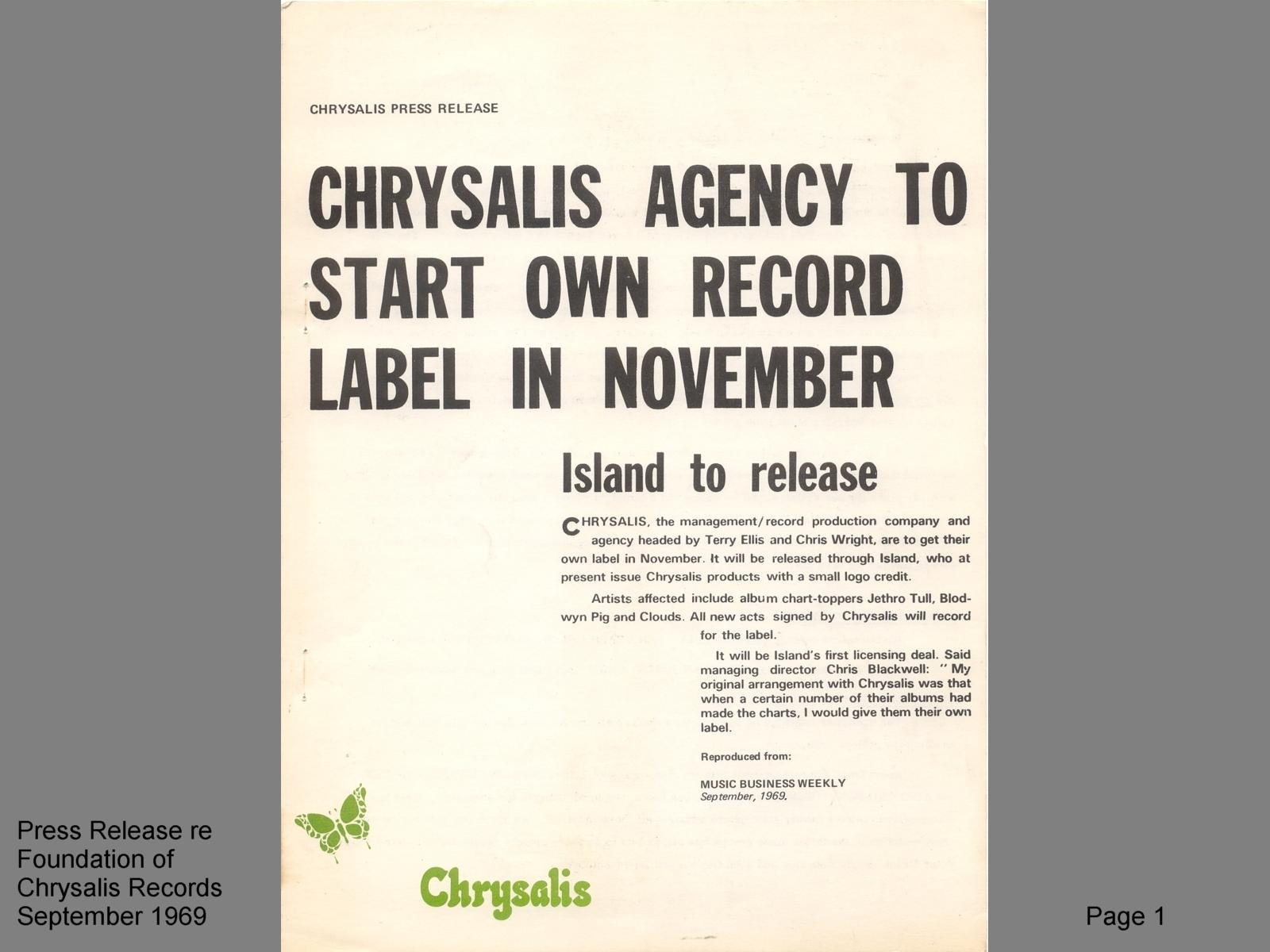 Chrysalis Press Release Sept 1969
